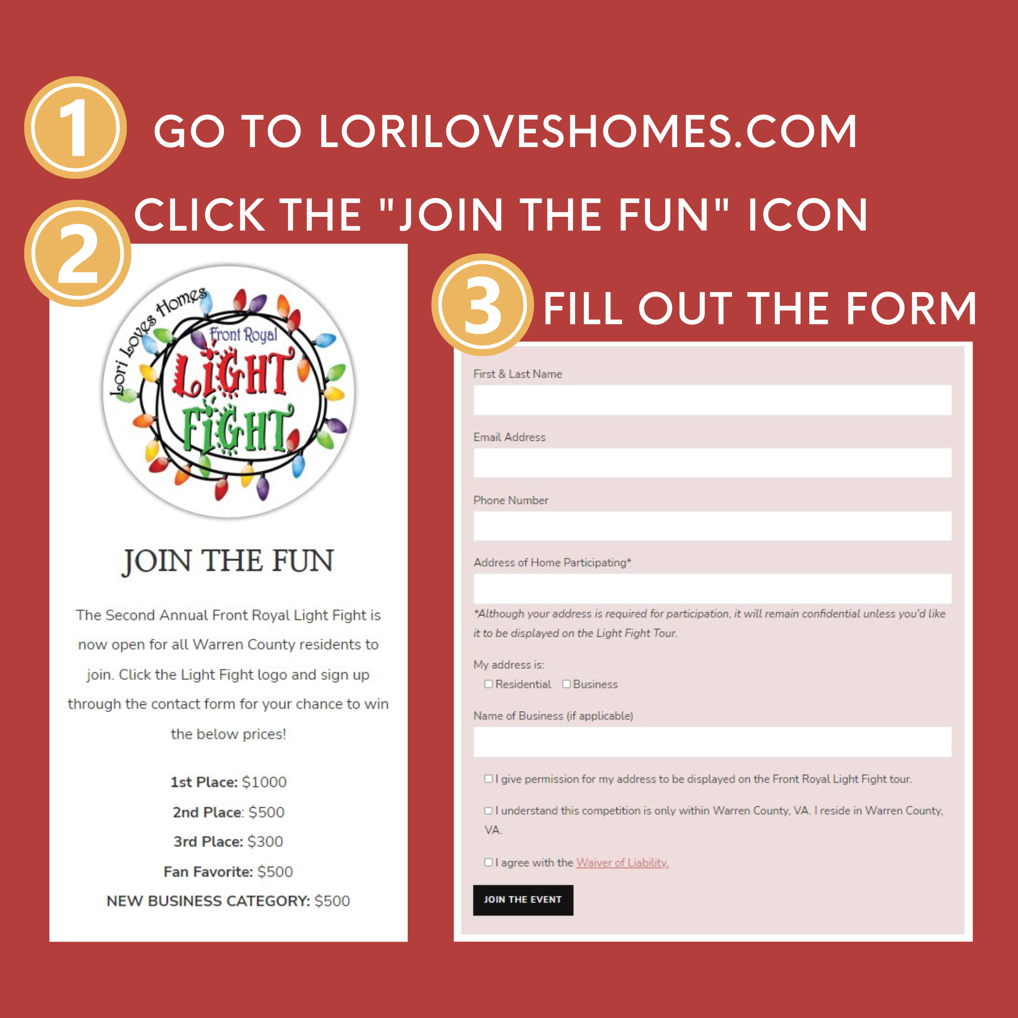 Signing up for this Front Royal Light Fight competition couldn’t be easier! Simply visit the loriloveshomes.com website, click “JOIN THE FUN”, fill out the sign-up form, and congratulations- you are now signed up! We will be in contact with you via email with the next steps! Best of luck to all!
